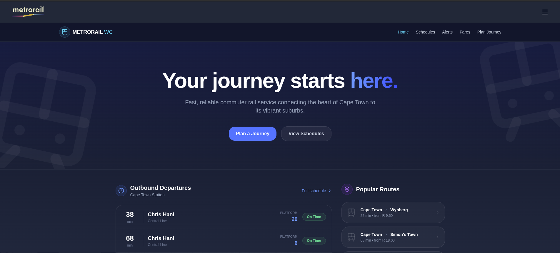 A metrorail website to find schedules, routes, and ticketing information for South African commuters.